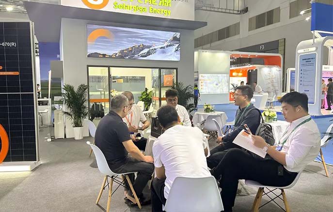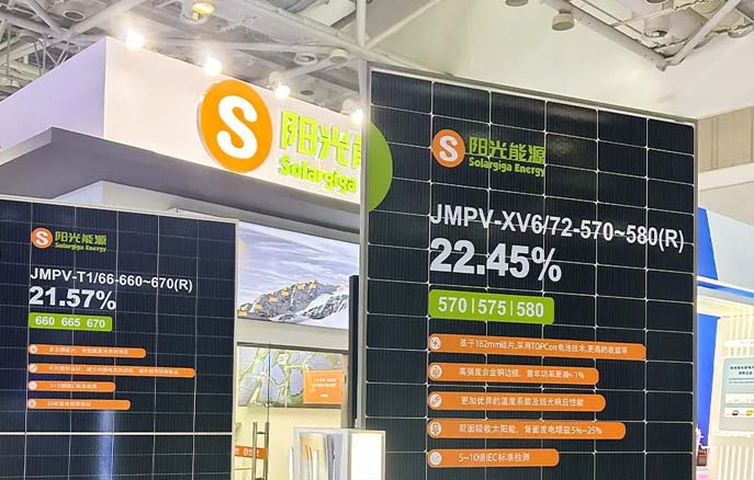 本屆展會,陽光能源重點展示了Giga-N系列兩款高效產品,分別是182 72版型雙玻和182 54版型單玻全黑組件,采用前沿的N型TOPCon技術,具備高效率、高發電量、高品質等多重優勢,能夠為客戶帶來更高的價值。其中,182 54版型單玻全黑組件是陽光能源面向全球分布式市場打造的高端產品之一,外觀精美,量產效率可達21.76%,被廣泛應用于建筑屋頂等應用場景。