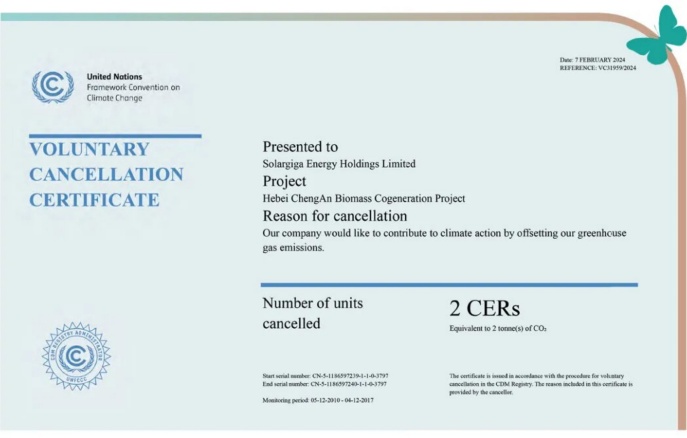 于報告期內,陽光能源成功實施了多項減碳措施,包括利用碳抵消來實現溫室氣體排放強度的降低。我們利用的碳抵消專案是聯合國清潔發展機制(CDM)的河北成安生物質熱電聯產專案(專案編號:3797)。該專案產生的電力出售給河北省電網,以替代燃煤發電廠的產能。此項目不僅減少了溫室氣體排放,還促進了資源效率、環境保護和對當地社區的社會經濟效益。通過此項目獲得的核證減排量(CERs)對于實現2022年在杭州舉行的第19屆亞洲運動會和第4屆亞洲殘疾人運動會的碳中和起到了關鍵作用。