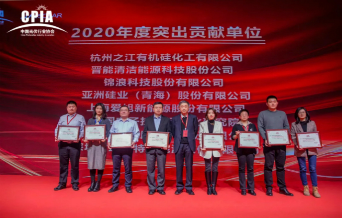 為感謝2020年度在協(xié)會各項(xiàng)會議活動、標(biāo)準(zhǔn)及戶用工作等方面,做出突出貢獻(xiàn)的會員單位,在2020年中國光伏行業(yè)年度大會期間,特授予天合光能股份有限公司、晶澳太陽能科技股份有限公司、晶科能源有限公司、陽光電源股份有限公司、浙江正泰新能源開發(fā)有限公司、隆基綠能科技股份有限公司、華為技術(shù)有限公司、錦州陽光能源有限公司、通威股份有限公司、杭州之江有機(jī)矽化工有限公司、晉能清潔能源科技股份公司、錦浪科技股份有限公司、亞洲矽業(yè)(青海)股份有限公司、上海愛旭新能源股份有限公司、蘇州賽伍應(yīng)用技術(shù)股份有限公司、深圳古瑞瓦特新能源股份有限公司、中國電子技術(shù)標(biāo)準(zhǔn)化研究院17家單位“2020年度突出貢獻(xiàn)獎”。