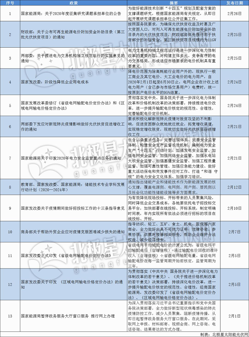 由此,北極星太陽能光伏網(wǎng)梳理了2月光伏政策,其中國家層面共出臺(tái)13項(xiàng),涉及光伏扶貧、電力交易、電力安全等;地方層面共21項(xiàng),涉及平價(jià)上網(wǎng)、光伏補(bǔ)貼、分佈式光伏、BIPV等多個(gè)方面。